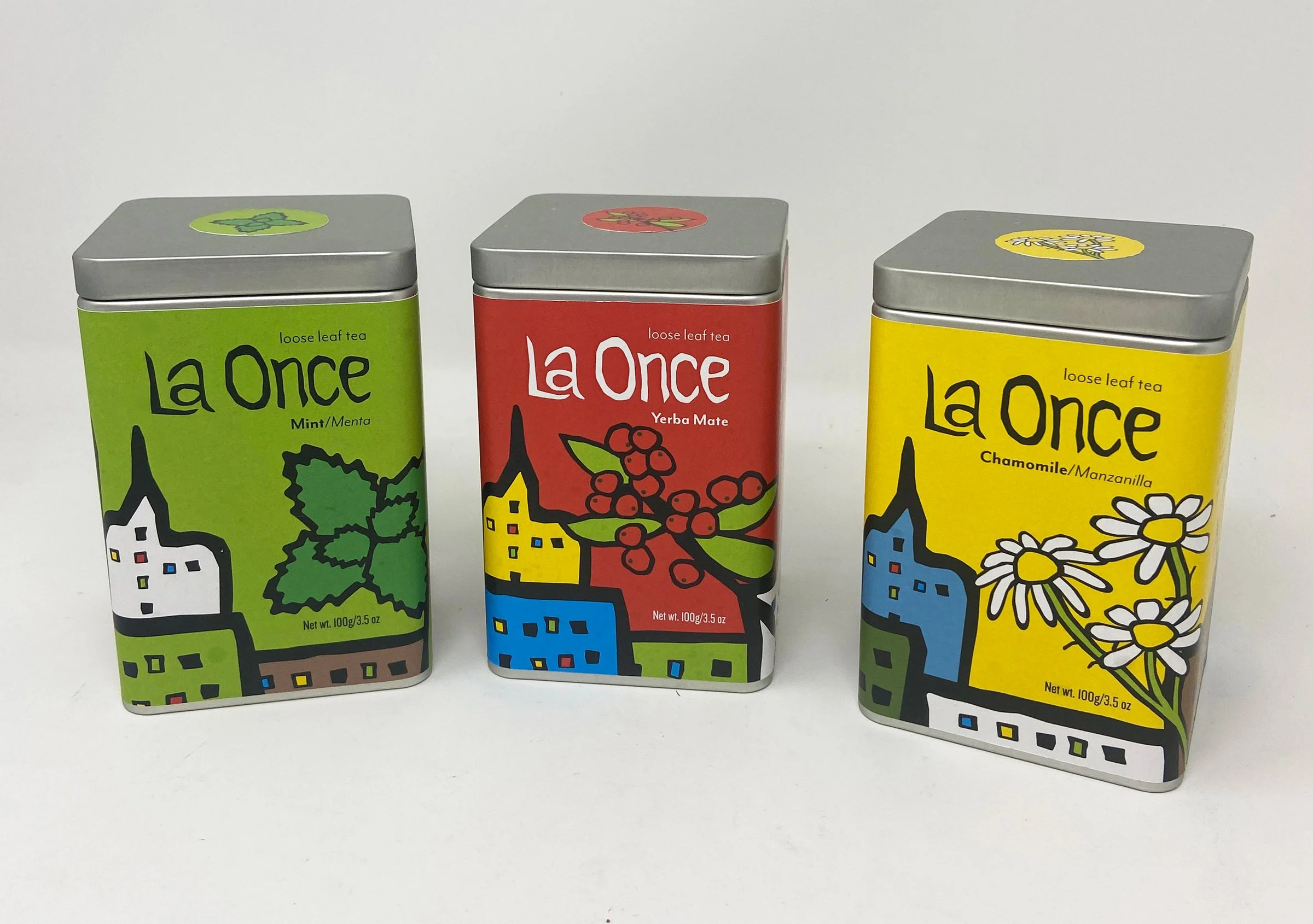 The final design for La Once loose leaf tea packaging utilized an illustration of each flower/plant that is used in each type of tea: mint, yerba mate, and chamomile. This natural element in combination with the varying colors of the packaging allows for easy differentiation between flavors and has a more interesting and detailed appearance.